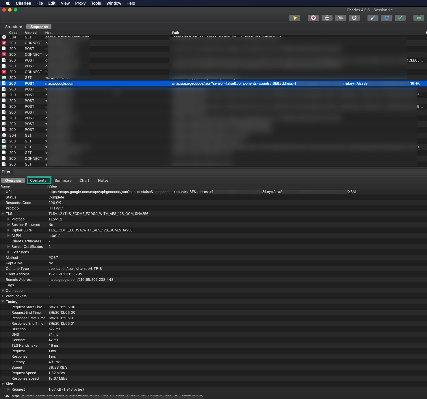 I opened an app I can use for home delivery of food. When I want to order food I must enter my address. Now I can see in Charles Proxy that the app itself is then sending that address with a POST request to maps.google.com to find addresses matching my search term.