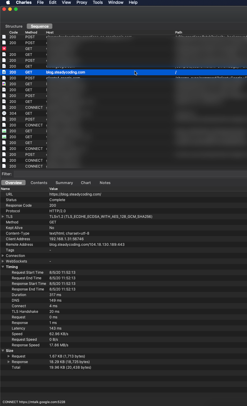 When I open Chrome on my iPhone, go to https://blog.steadycoding.com/, then it will show up in Charles on my mac. Not too exiting here, since this will give me a static page, but you can see the host, path, http method, TLS protocol, contents of the request/response etc. This is pretty neat, and a good start. I've blurred everything else as you can see, for obvious reasons, but there's a lot of different requests to inspect here.