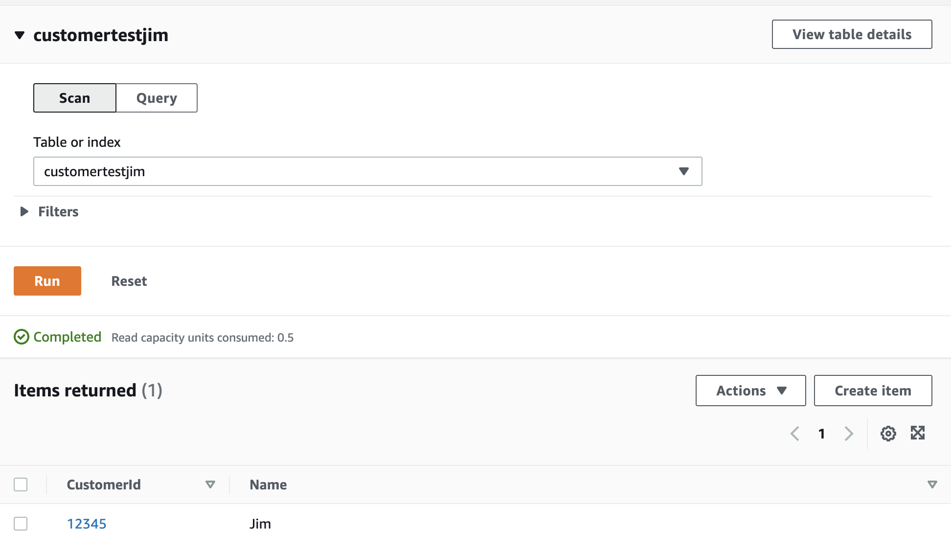 I just manually inserted an item through the AWS portal. Once that is done, all I have in my table is one record with two attributes, CustomerId and Name: