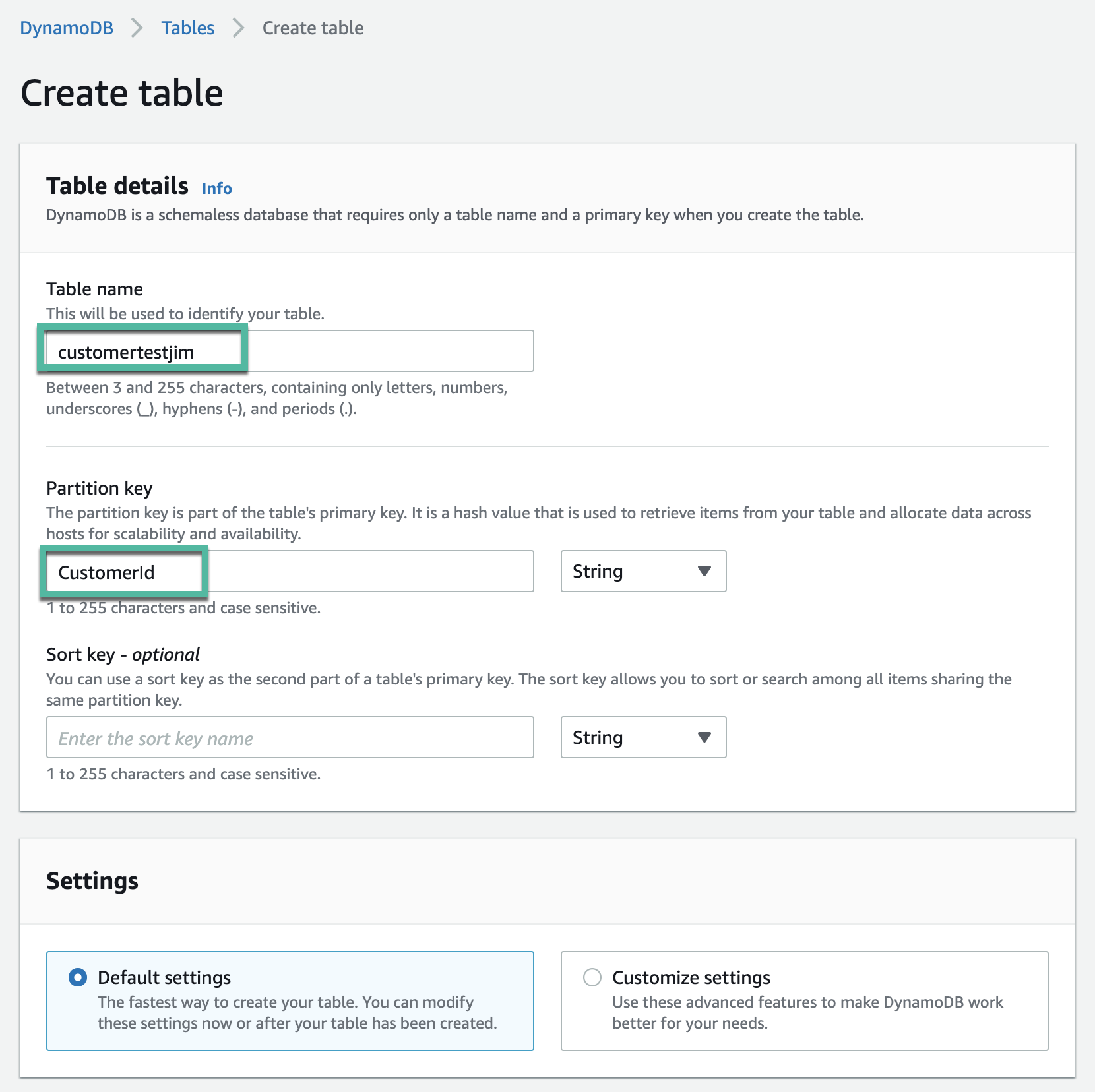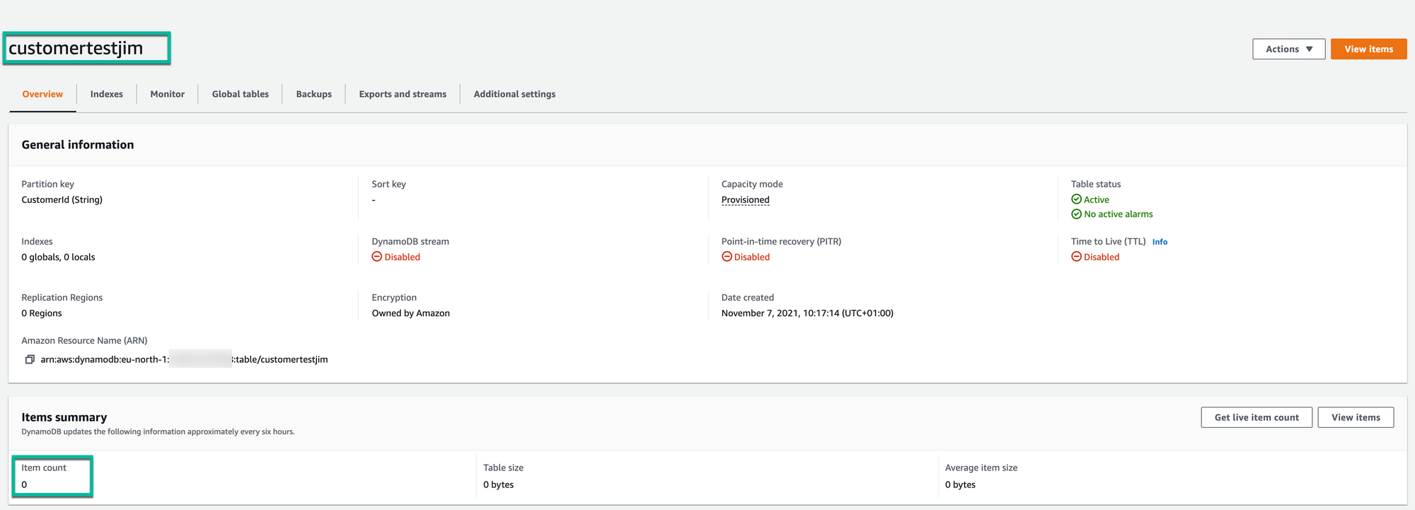 First head into the AWS portal and create a table, I called mine customertestjim. I named my partition key CustomerId and kept the rest as default settings, you can do the same. You should now see your table in the portal with 0 items in it: