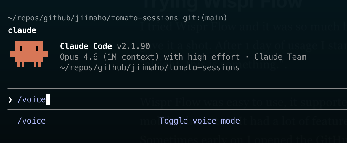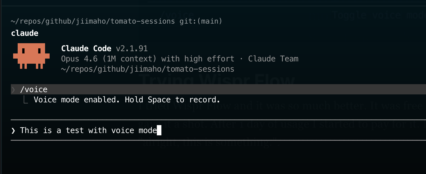 Claude Code voice mode lacks some quite important features such as an equivalent feature like what Wispr has in terms of dictionary that I shared above, but I can live without that for now and save those dollars. Overall, I'm now happy with native voice mode in Claude: