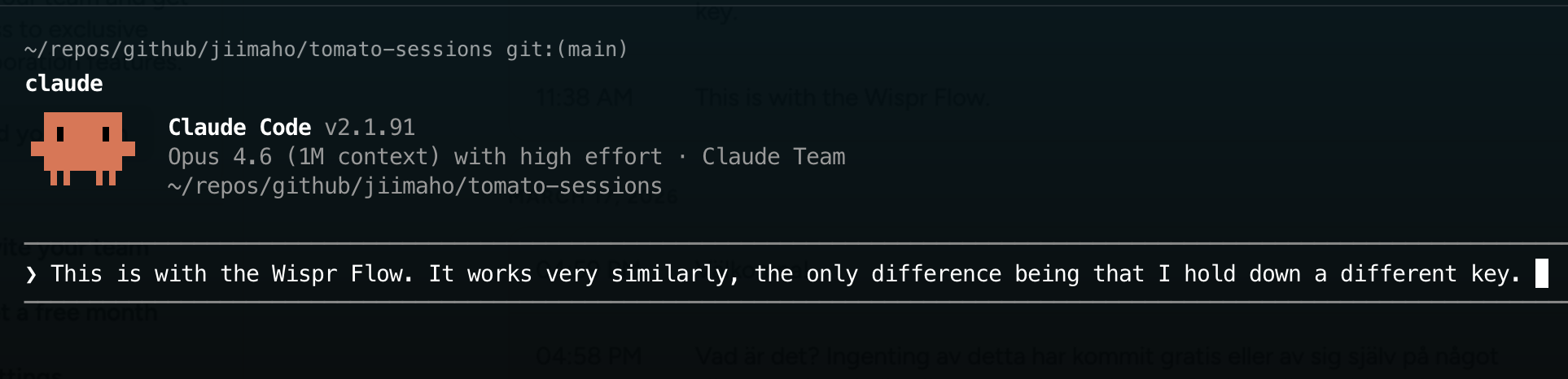 Since Claude's built-in voice tool was so bad, I had to search around and try something else. Very quickly I stumbled upon Wispr Flow and it was so much better. It was free for I think 14 days, so I gave it a shot (around 150 SEK a month otherwise). I almost immediately felt "alright, this is something".