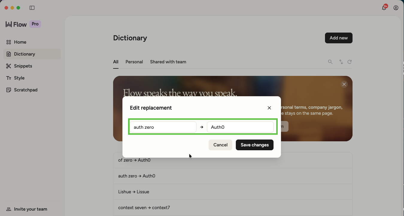 One thing I found very helpful with Wispr is that it has a dictionary feature that lets me help Wispr to understand what I'm saying better. The whole point with a voice tool like this is that it will understand what you say. But some things are seriously weird and close to impossible to guess or assume. At my company we use an identity provider called Auth0. It's not trivial for a voice to understand that that is what i'm saying. Dictionary feature to the rescue! The dictionary feature lets me map "weird words" into real words, like this: